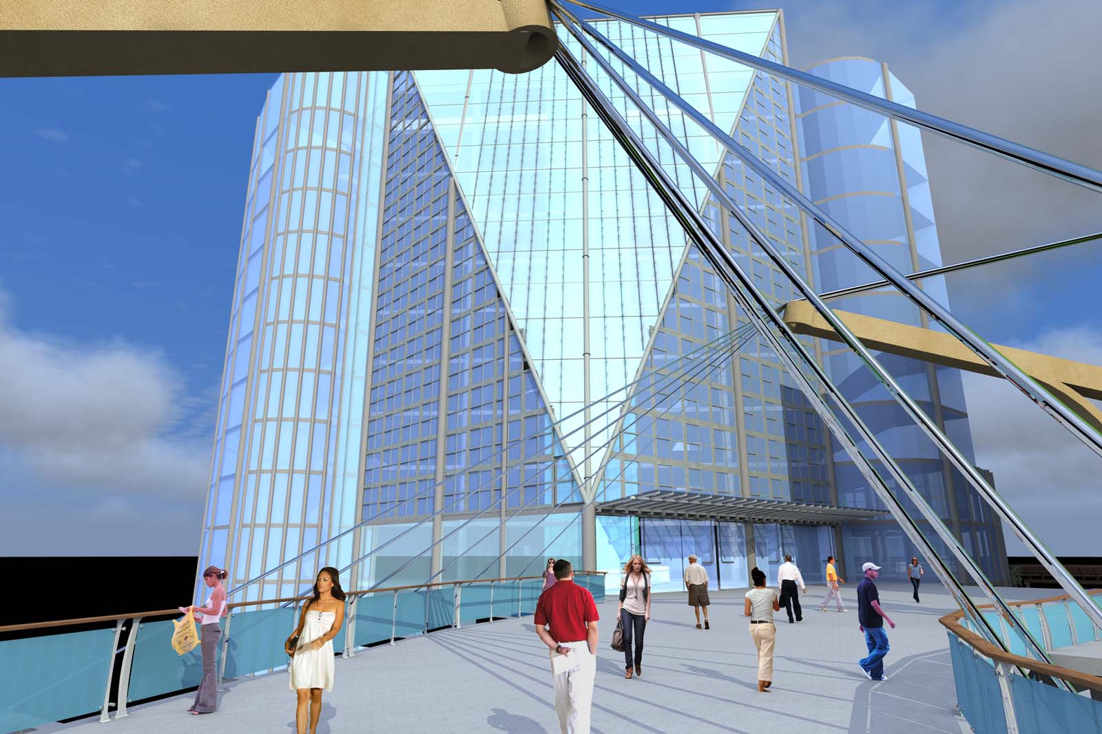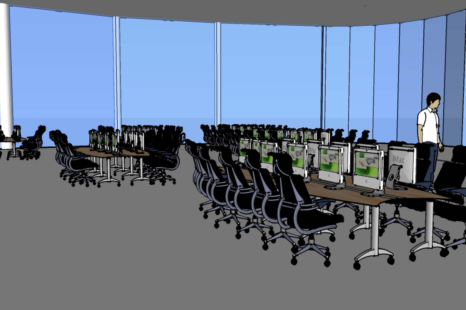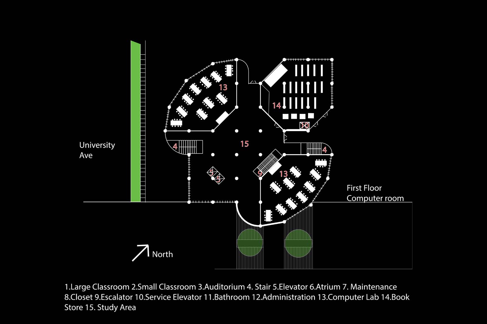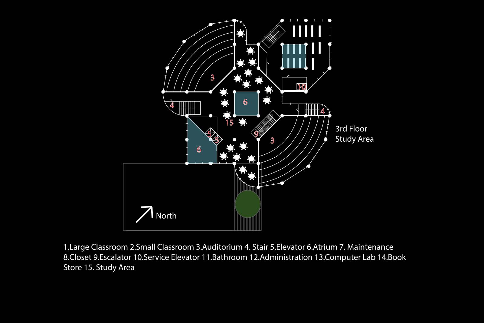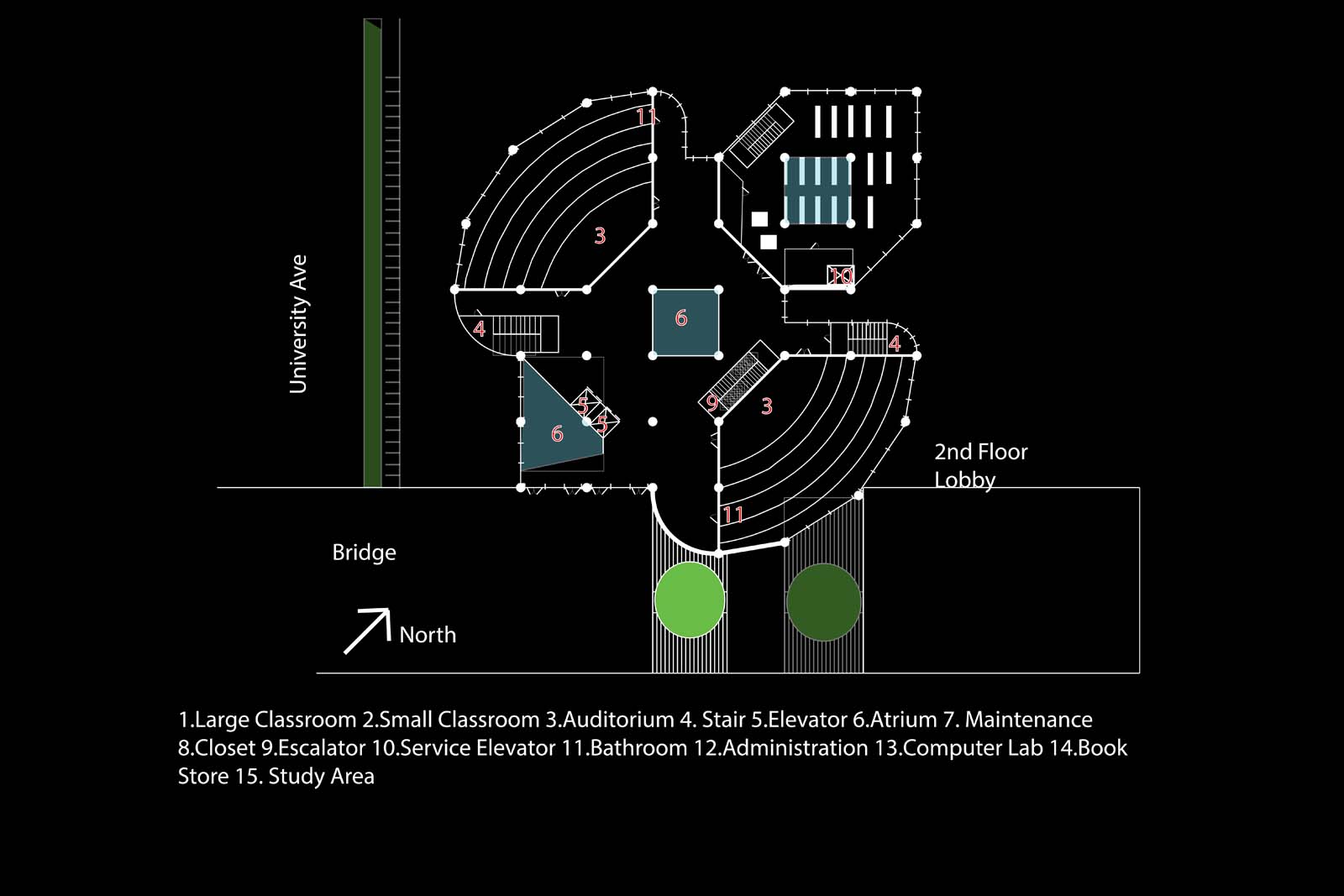 This project is a continuation of project 301. The opposite side of the bridge is the start of this project. The building is a new tower housing the english, language art, psychology, and sociology departments on campus. Students can enter from the second floor connected by the bridge or from the first floor. This design creates an new icon for the university. The first floor has a computer lab and bookstore. The building has two large classroom.
