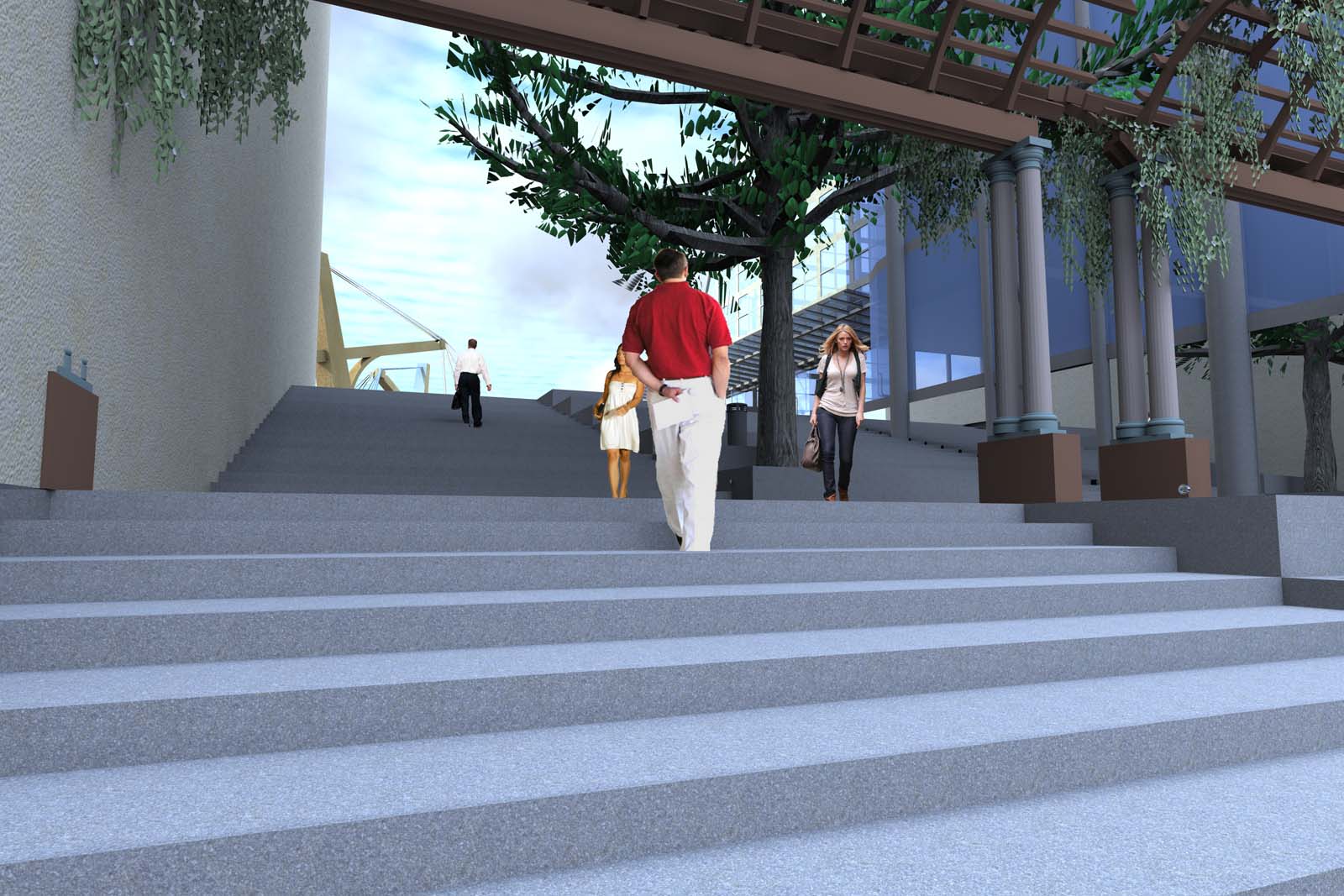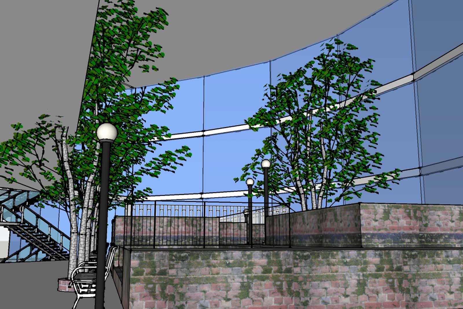 This project is two projects in one, a walkway bridge across a busy street at the edge of ULL campus and a visitor center under the bridge. The walkway is an experiential walkway with sitting and gathering spaces along with areas for shops. The visitor center has to have a women's bathroom and men's bathroom along with an information desk. This project is the first time for rendering and large board design.